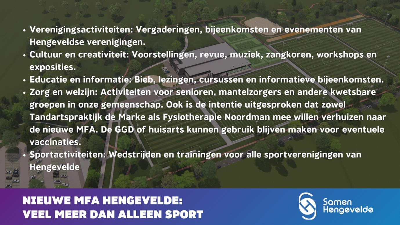 De nieuwe MFA wordt een plek in Hengevelde waar iedereen terecht kan. Natuurlijk blijft sport een belangrijk onderdeel, maar we hebben de ambitie om een locatie te creëren die voor veel meer doeleinden geschikt is. Het wordt een plek waar jong en oud elkaar kunnen ontmoeten, waar naast de sport ruimte is voor cultuur, educatie, zorg en allerlei sociaal-maatschappelijke activiteiten.